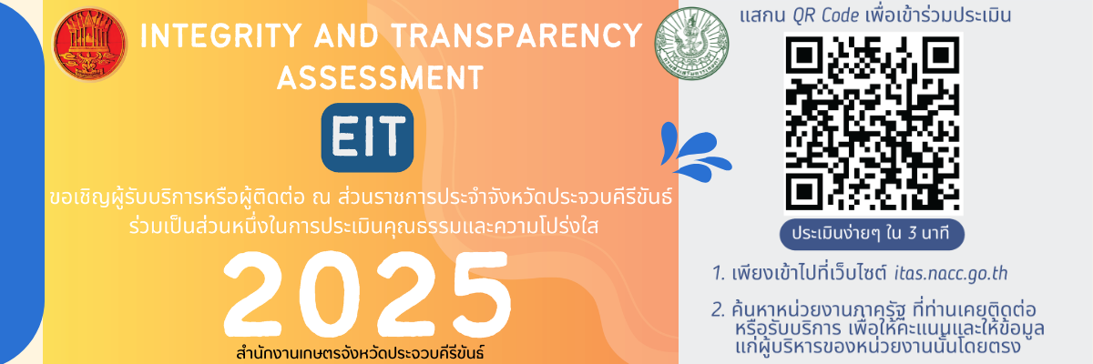 - ประกาศสำนักงานเกษตรจังหวัดประจวบคีรีขันธ์ เรื่อง รายชื่อราชการพลเรือนสามัญ ผู้มีผลการปฏิบัติราชการในระดับดีเด่น และดีมาก รอบการประเมินที่ 2 ประจำปีงบประมาณ พ.ศ. 2568 25 กันยายน 2568