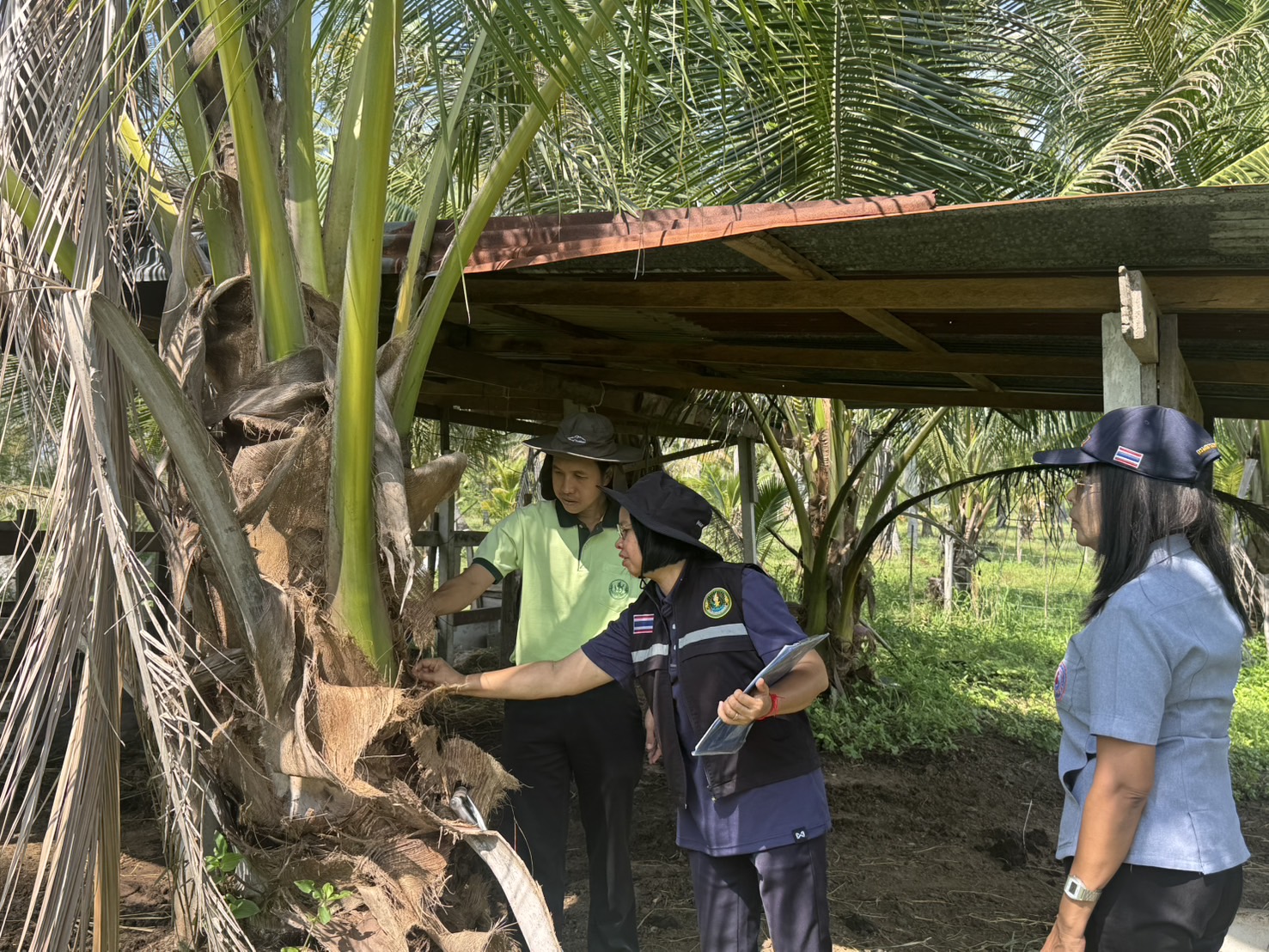#เกษตรประจวบฯ สำรวจติดตามและให้คำแนะนำป้องกันกำจัดศัตรูมะพร้าว 📆วันที่ 1 พฤศจิกายน 2567 🌴🌴นางศันสนีย์ เกษตรสินสมบัติ เกษตรจังหวัดประจวบคีรีขันธ์ มอบหมายให้นายโกสินทร์ สุนทรโสภาหัวหน้ากลุ่มอารักขาพืช พร้อมด้วยเจ้าหน้าที่กลุ่มอารักขาพืช ร่วมกับเกษตรอำเภอเมืองฯ และเจ้าหน้าที่สำนักงานเกษตรอำเภอเมืองฯ สำรวจติดตามและให้คำแนะนำการป้องกันกำจัดศัตรูมะพร้าว จากการสำรวจพบว่าแปลงของเกษตรกร มีการระบาดของด้วงงวงมะพร้าว โดยเจ้าหน้าที่ได้แนะนำให้เกษตรกรใช้สารเคมีไดซิอะนอล 60% EC อัตรา 80 มิลลิลิตรผสมน้ำ 20 ลิตร ราดบริเวณที่มีรอยแผลหรือเนื้อเยื่ออ่อนโดยใช้ปริมาณ 1 – 1.5 ลิตรทุก 15 – 20 วัน 1-2 ครั้งในช่วงระบาด เพื่อเป็นการป้องกันกำจัดด้วงงวงมะพร้าวที่ระบาดในแปลง 🏠ณ แปลงมะพร้าวของนางบุปผา รักษาเวียง หมู่ที่ 9 ตำบลห้วยทราย อำเภอเมืองฯ จังหวัดประจวบคีรีขันธ์
