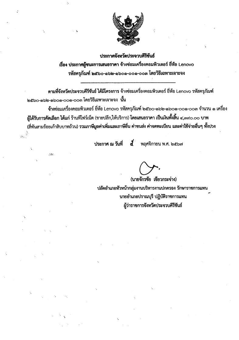 ประกาศผู้ชนะเสนอราคาจ้างซ้อมเครื่องคอมพิวเตอร์ยี่ห้อ Lenovo อำเภอปราณบุรี