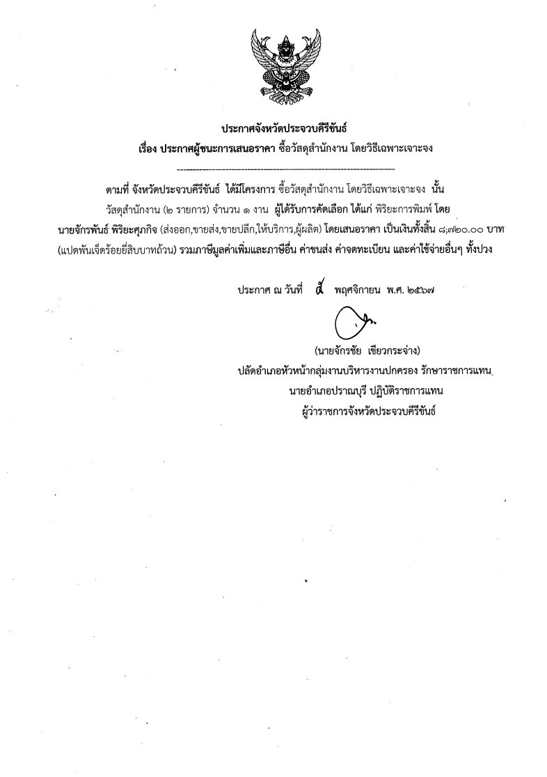 จัดซื้อวัสดุสำนักงาน โดยวิธีเฉพาะเจาะจง ของสำนักงานเกษตรอำเภอปราณบุรี