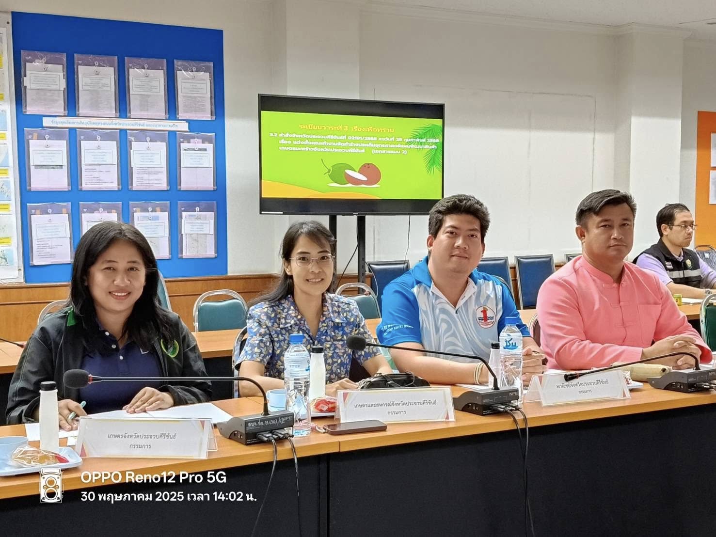วันที่ 30 พฤษภาคม 2568 นางศันสนีย์ เกษตรสินสมบัติ เกษตรจังหวัดประจวบคีรีขันธ์ มอบหมายให้ นางสาวธนนันท์ สนสาขา นักวิชาการส่งเสริมการเกษตรชำนาญการ และนางสาวปาณิสรา เอกจีน นักวิชาการส่งเสริมการเกษตรปฏิบัติการ เข้าร่วมประชุมคณะกรรมการจัดทำแผนพัฒนาสินค้าเกษตรมะพร้าวจังหวัดประจวบคีรีขันธ์ (พ.ศ. 2567-2570) ครั้งที่ 2/2568 โดยมี นายปรีดา สุขใจ รองผู้ว่าราชการจังหวัดประจวบคีรีขันธ์ เป็นประธานในการประชุมฯ ดังกล่าว จัดโดยสำนักงานสภาเกษตรกรจังหวัดประจวบคีรีขันธ์ ในที่ประชุมมีการพิจารณา ดังนี้ 1. การวิเคราะห์ ร่าง SWOT พันธกิจ วัตถุประสงค์ เป้าประสงค์ และประโยชน์ที่คาดว่า จะได้รับซึ่งได้ผ่านการพิจารณาแก้ไข/เพิ่มเติม จากคณะทำงาน ทั้ง 3 คณะ 2. ประเด็นยุทธศาสตร์ที่ 1 ส่งเสริมและพัฒนาการเพิ่มประสิทธิภาพการผลิตมะพร้าว 3. ประเด็นยุทธศาสตร์ที่ 2 พัฒนาประสิทธิภาพการแปรรูปและการเพิ่มมูลค่าผลิตภัณฑ์ 4. ประเด็นยุทธศาสตร์ที่ 3 พัฒนาการตลาด ณ ห้องประชุมสิงขร ชั้น 3 ศาลากลางจังหวัดประจวบคีรีขันธ์