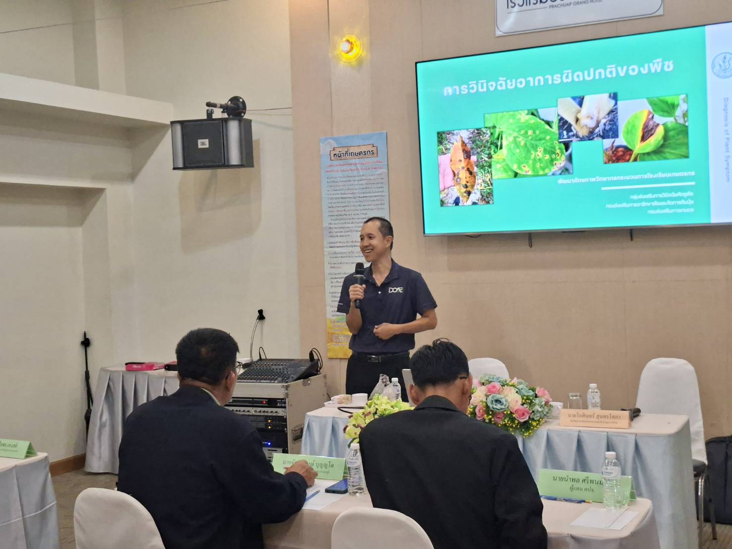 วันที่ 23 เดือน กรกฎาคม พ.ศ. 2568 🌴🍍นางศันสนีย์ เกษตรสินสมบัติ เกษตรจังหวัดประจวบคีรีขันธ์ มอบหมายนายโกสินทร์ สุนทรโสภา หัวหน้ากลุ่มอารักขาพืช พร้อมด้วยเจ้าหน้าที่กลุ่มอารักขาพืช ร่วมเป็นวิทยากรอบรมโครงการพัฒนาผู้แทนเกษตรกร กิจกรรมพัฒนาผู้แทนเกษตรกในเขตปฏิรูปที่ดินจังหวัดประจวบคีรีขันธ์ ปีงบประมาณ พ.ศ. 2568 โดยได้บรรยายให้ความรู้ให้กับเกษตรกร เกี่ยวกับโรคพืชและการป้องกันกำจัดศัตรูพืชให้แก่เกษตรกรในเขตปฏิรูปที่ดิน จำนวน 12 ราย 🏠ณ ห้องประชุมทองเนื้อเก้า ชั้น 2 โรงแรมประจวบแกรนด์ อำเภอเมืองประจวบคีรีขันธ์ จังหวัดประจวบคีรีขันธ์