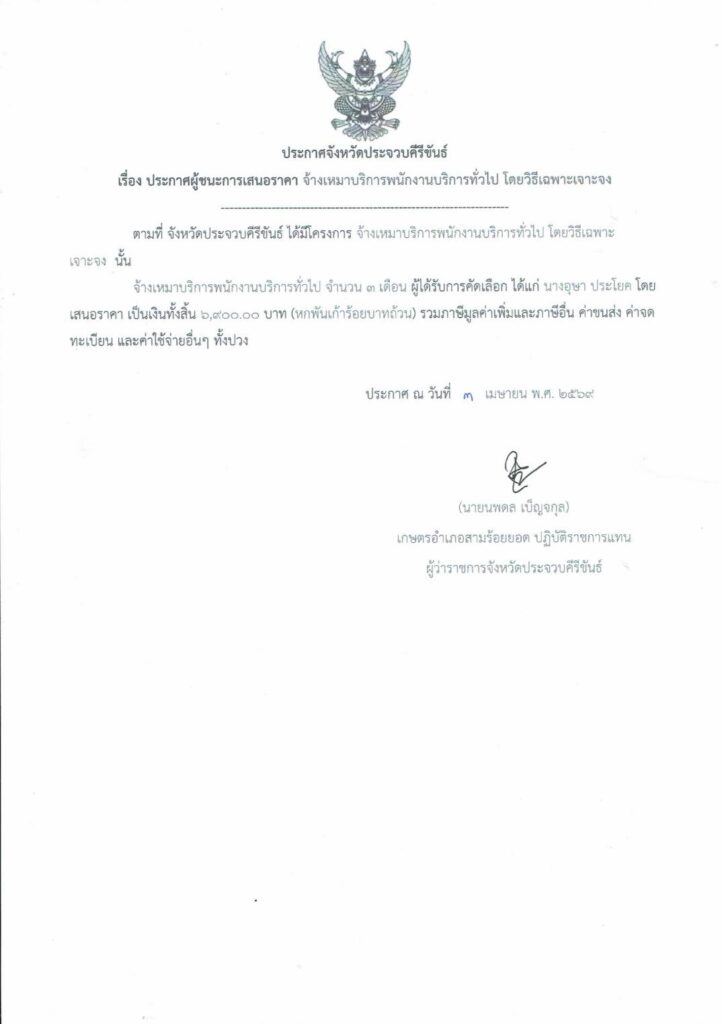 ประกาศผู้ชนะ การเสนอราคา จ้างเหมาบริการพนักงานบริการทั่วไป โดยวิธีเฉพาะเจาะจงBy สำนักงานเกษตรอำเภอสามร้อยยอด / 3 เมษายน 2026